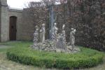 Tien heiligenbeelden en een groepje gewone christenen kijken op naar de centrale levensboom (symbool van Christus). Wie toont ons de weg? De heilige Franciscus, Moeder Theresa, Godelieve, Andreas, Sint-Elooi, pater Pio, pater Damiaan, Maria en Luther. Ook een groep anonieme gelovigen laat zich inspireren door de levensboom. Bij sommige beelden is het typische attribuut te zien (bijv. dieren, wurgband,...). Op een rotsformatie met rondom een bakstenen pad vormen de bruine tinten van de beelden en de zwarte levensboom een harmonieus geheel. De beeldengroep werd gerealiseerd n.a.v. 2000 jaar christendom. |