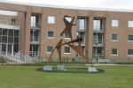 Deze creatie van een Ieperse kunstenares is gemaakt in cortenstaal. Het geheel steunt op drie pijlers die diep in de grond zijn verankerd en symbool zijn voor de drie instanties die nauw met de functie van het gebouw verbonden zijn: het OCMW, de zustergemeenschap, het verplegend en verzorgend personeel van de instelling, vroeger en nu. Het bovenste gedeelte stelt bewegende figuren voor in een abstracte vormgeving. Niettegenstaande de bewoners van de huidige RVT in de herfst van het leven zijn gekomen, wil de wervelende beweging van de figuren toch een optimistische kijk op het leven blijven uitstralen. De kunstenares stelt bewust abstracte figuren voor; het mocht niet te realistisch zijn omdat dan te veel gemijmerd kan worden over het eigen leven. De bewegende figuren worden weergegeven in een spel van gebogen lijnen, verwijzend naar de vrouw-figuur die de kunstenares ook is. |